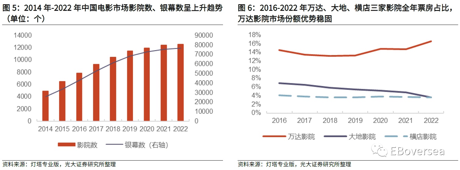3)渠道端:影院、银幕数维持增长韧性,万达院线市场份额优势稳固。22年中国电影市场共计12586家影院、76607块银幕;头部影投公司竞争格局稳定,16年以来万达院线票房收入、观影人次稳居各大院线第一,23年以来(截至1月26日)万达累计票房8.82亿,以票房占比全国计算的市占率达12.7%,累计观影人次1531.7万次,占比全国11.2%。