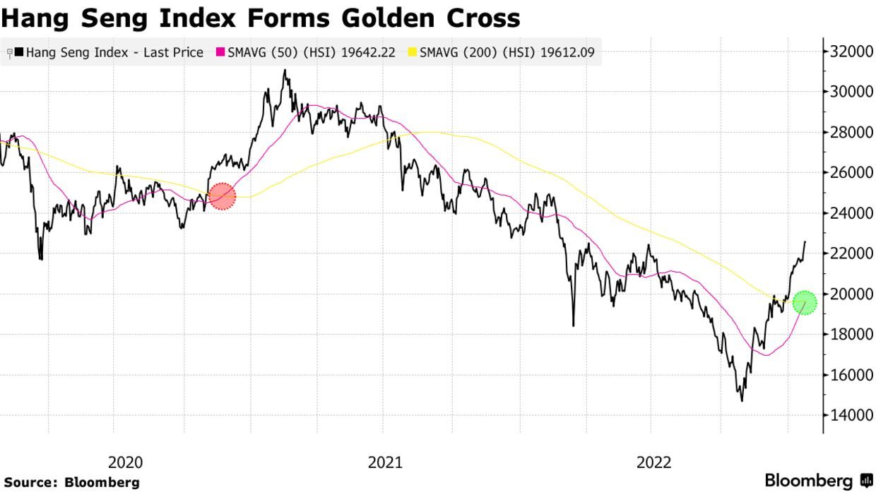 智通财经APP获悉,恒生指数50日移动均线已突破200日移动均线,这一基准股指形成了所谓的“黄金交叉”,而这一技术形态被一些投资者视为看涨信号。据悉,当该技术形态上次出现在2020年11月时,该基准指数在接下来的三个月里上涨了11%。受中国重新开放的推动,恒生指数连续上涨6周,为三年来最长的连续上涨时间。该指数自去年10月触底以来已上涨54%。