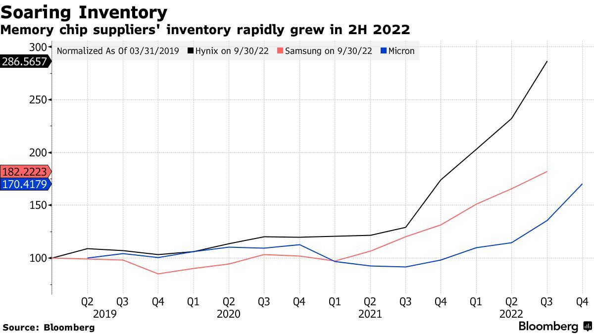 库存激增——存储芯片供应商的库存在2022年下半年迅速增长