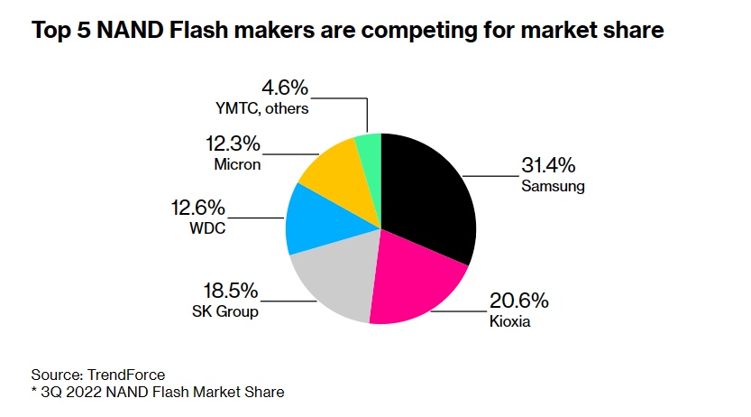 在之前的行业衰退中,存储行业也有合并,这次可能也不例外。知情人士本月透露,NAND闪存制造商西部数据(WDC.US)和铠侠的交易谈判正在取得进展。不过,两家公司已经谈及联合生产计划,因此合并并不一定会导致产量下降。
