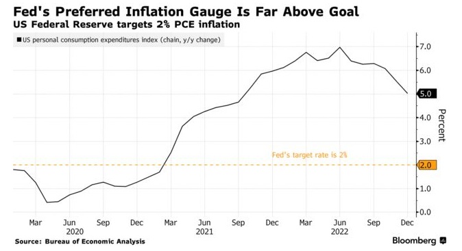 乐观的背后是通胀的下降。美联储最青睐的通胀指标个人消费支出价格指数(PCE)在去年12月同比上涨5%,尽管仍远高于美联储2%的目标,但低于6月份的7%。