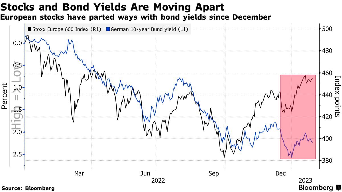 自去年12月以来,欧洲股市和债券的收益率已经分道扬镳