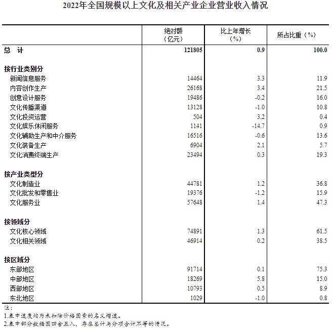2022年全国规模以上文化及相关产业企业营业收入增长0.9%