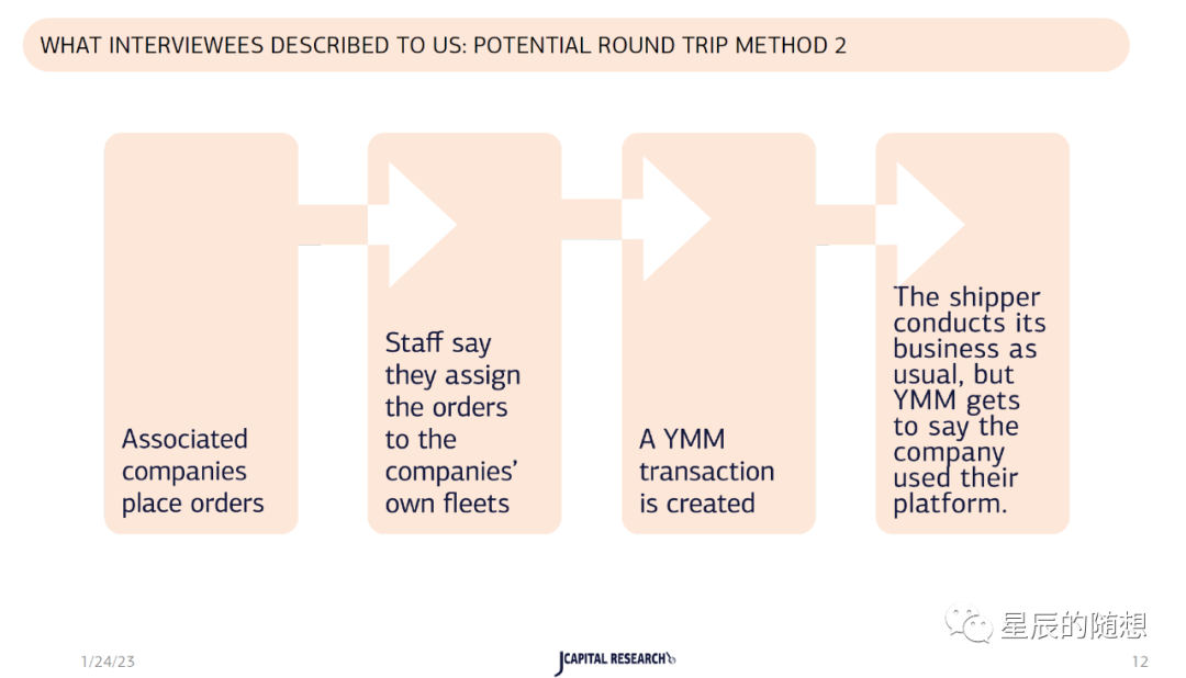 首先,J Capital这篇做空报告最核心的观点怀疑满帮平台的交易量虚增了6-10倍,也就是刷单。J Capital称通过采访一些满帮的前员工得知,满帮有通过几种方式刷单,1、成立一些壳公司冒充发货公司发布虚假货运订单,然后销售人员找到一些假司机接订单,销售人员从合作银行借钱给假司机付掉运费,假司机把钱还给销售人员返还银行贷款,同时备注只要借款一周内归还不需要付利息。2、公司找一些熟悉的自己有运输车队的发货公司帮忙,虽然其实是用自己公司的车队运输,但是假装在满帮的平台上走一下流程。