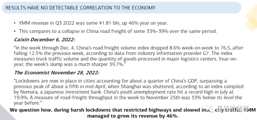 报告中提到2022年Q3公司收入18.1亿元,同比增长46%,但是同期中国货运大盘同比下滑33-39%。J Capital质疑满帮如何在三季度疫情管控下实现比大盘好不少的业绩。