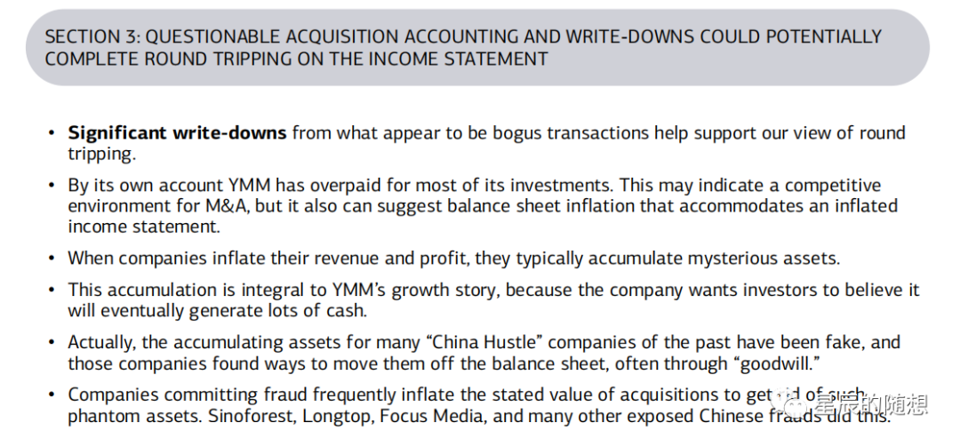 报告中提出公司在最近几年有很大的减值计提损失,其中不少是由于收购的公司经营不善做了减值计提导致,这也有可能导致公司收入的虚增。