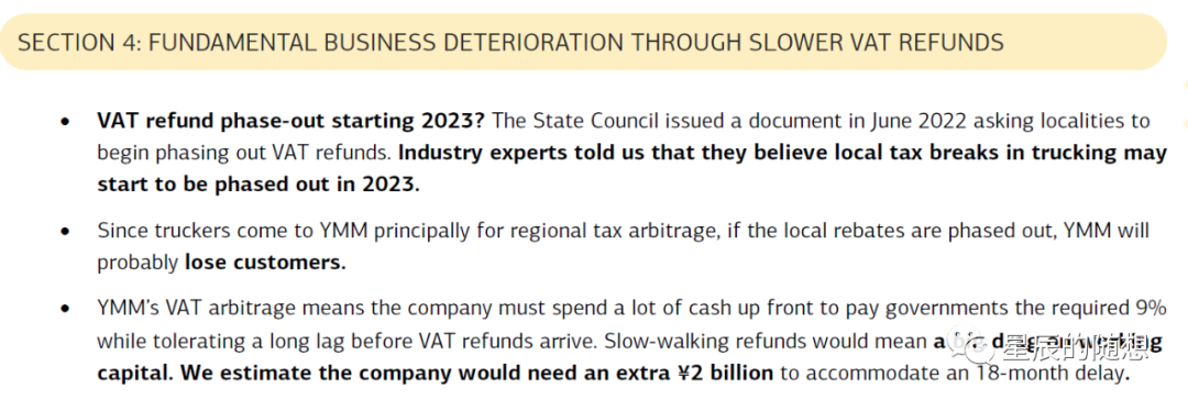 报告中提到了公司前员工和专家认为政府对于满运宝业务增值税税返优惠政策在2023和2024年会逐步减少直至取消,从而会对公司业绩造成不少影响。