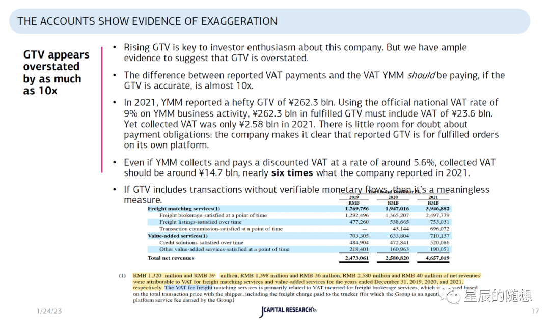 其次,J Capital有一个认为可以交叉验证满帮交易量虚增的观点是公司GTV金额和交的VAT(增值税)金额严重不匹配,实际上是因为作为外资做空机构对公司的业务尤其是满运宝业务理解错误导致的。