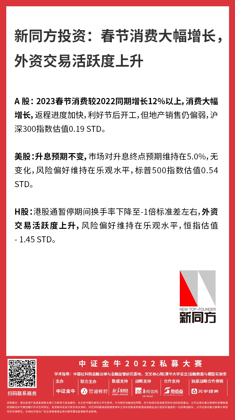 智通财经APP获悉,由元宇证券独家战略支持的中证金牛2022私募大赛于12月1日正式启动,赛事正如火如荼开展。不少参赛机构研究团队及产品主理人就近期市场走势和行业展望发表真知灼见。深圳市新同方投资管理有限公司指出,春节期间国内消费大幅增长,外资交易活跃度上升。