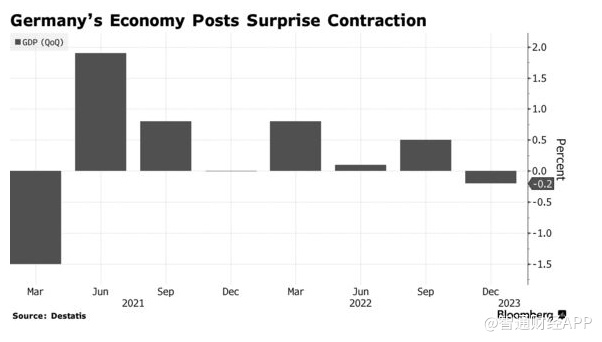 智通财经APP获悉,德国联邦统计局公布的数据显示,德国第四季度季调后GDP初值环比下降0.2%,不及市场预期的0%。这也意味着,德国经济可能会陷入衰退(通常定义为经济连续两个季度收缩)。