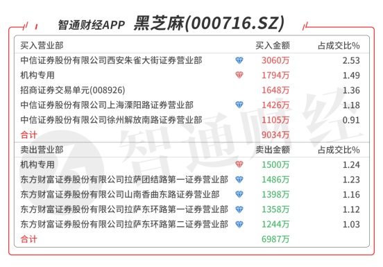 黑芝麻(000716.SZ):龙虎榜阵容豪华,机构席位对倒卖出155万元,买一是顶级游资方新侠的席位买入3058万元,买四是顶级游资孙哥的席位买入1416万元,当日净买入4979万元,该股调整充分,预计压力位在10日线附近。