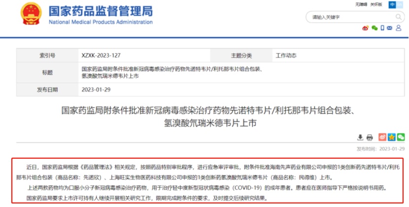 就在辉瑞冲上微博热搜的当天,君实生物的氢溴酸氘瑞米德韦片(VV116,商品名称:民得维)附条件获批上市,用于治疗轻中度新型冠状病毒感染(COVID-19)的成年患者。