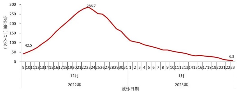 数据显示,全国(不含港澳台)发热门诊(诊室)就诊人数于2022年12月23日达到峰值286.7万人次,随后连续下降,2023年1月23日下降到6.3万人次,较峰值下降了97.8%。