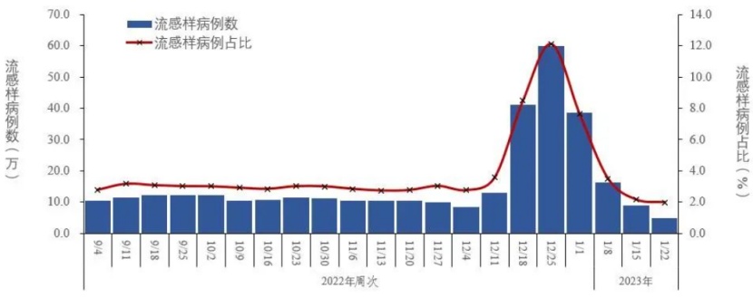 另一方面,根据全国总共824家流感监测网络哨点医院的监测数据,2022年9月-12月上旬,哨点医院每周流感样病例(体温≥38℃,伴咳嗽或咽痛之一)数量稳定在10万左右,第50周(12月12日-18日)明显上升至8.5%,第51周达到最高12.1%,第52周起快速下降,2023年第3周(1月16日-月22日)已下降至2.0%,回落至本轮疫情之前水平。