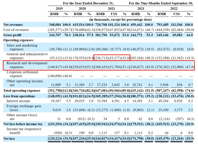 从费用端来看,公司运营费用主要集中在研发环节上,2019-2021年度,禾赛的研发投入分别达到1.50亿、2.30亿、3.68亿元人民币,占收比分别达43.0%、55.3%、51.1%。截至2022年前三季度,公司研发投入规模已超过2021全年水平达3.76亿元,占收比达47.4%。