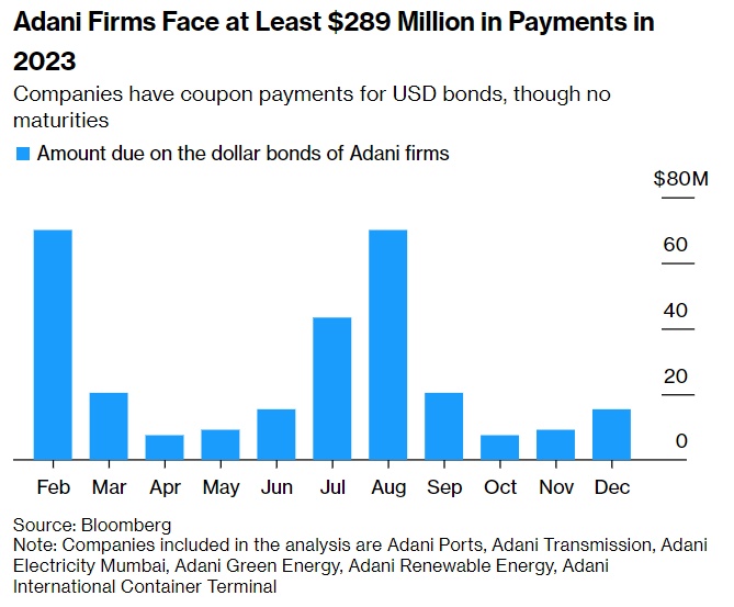 智通财经APP获悉,在美国知名做空机构兴登堡研究(Hindenburg Research)发布报告后,市场加强了对阿达尼集团债务的审查,投资者的注意力集中在该集团今后几个月的一系列债券利息截止日期上。数据显示,这家亚洲首富的集团至少有2.89亿美元的美元债券将于2023年到期。第一个截止日期是本周四,届时阿达尼集团旗下的阿达尼港口和经济特区公司必须为三份债券支付总计2470万美元的利息。