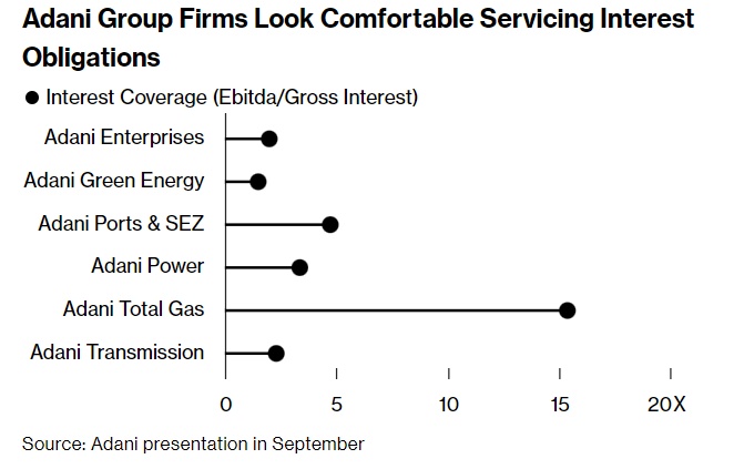 阿达尼在去年9月的一次演示中提及了其支付利息能力的指标,令投资者对即将到来的利息支付感到一些安慰。该集团旗下公司的利息覆盖率(EBITDA除以利息支出)的范围从大约2倍到超过15倍不等。一般而言,信用评估员认为良好的利息覆盖率应至少是2倍。