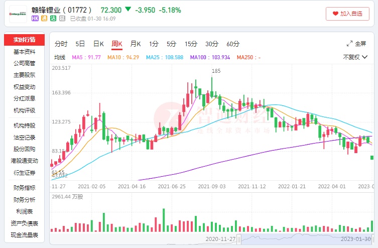 不过,与猛增的业绩相背离的则是该公司大幅走弱的股价:截止1月30收盘,赣锋锂业H股大跌超5%,报于72.3港元。而拉长时间线来看,2022年全年,其股价累跌超30%,离曾经的股价最高价185港元差距越来越大。