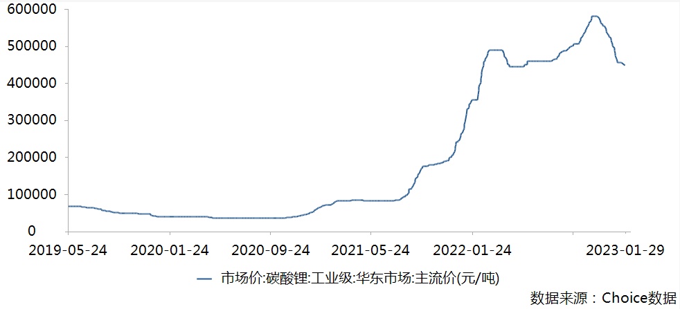 不过,需要注意的是,自2022年12月开始,锂价便开始显现回落态势。截至今年1月29日,工业级碳酸锂市场价已经跌至44.75万元/吨,相较去年11月29日57万元/吨,跌幅约为21.5%。而关于锂价高位回落的原因,市场普遍认为与“淡季效应”和“产能边际释放”有关。