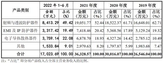 需要注意的是,招股书提示需要注意毛利率下降的风险。阿莱德在2019年度、2020年度、2021年度和2022年1-6月的主营业务毛利率分别为41.40%、45.47%、40.15%和37.06%,其中射频与透波防护器件的毛利率分别为38.60%、38.94%、30.23%和22.89%,EMI及IP防护器件的毛利率分别为46.98%、52.91%、42.24%和38.62%,总体上呈现一定的下降趋势,鉴于射频与透波防护器件收入仍占公司主营业务收入的50%左右,若射频与透波防护器件的毛利率进一步下降,可能对公司的盈利水平造成较大不利影响。