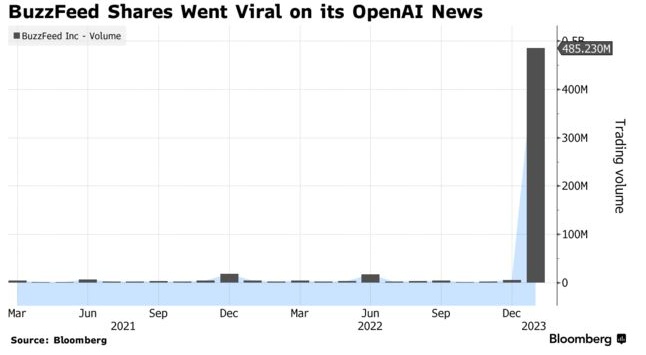 该等科技公司的消息使得人工智能相关股票于近期深受投资者欢迎。BuzzFeed股价上周飙升逾300%,成交量突破4.38亿股。本月成交量超过4.85亿股,而其月平均成交量不足2500万股。
