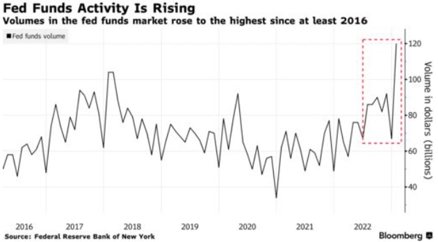 智通财经APP观察到,关键的联邦基金市场交易量升至1200亿美元,创近七年来的最高水平,表明美联储的紧缩政策正在给银行系统的流动性带来持续的压力。随着存款的流失,银行急需资金。根据纽约联储本周一公布的数据,1月27日,联邦基金每日借款额从上一个交易日的1130亿美元增至1200亿美元,为至少自2016年以来的最高水平。
