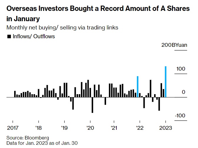 智通财经APP获悉,外国投资者正在大举重返中国股市,仅在1月份就抢购了比2022年全年还要多的股票。尽管有为期一周的假期,但通过与香港的交易联系,本月境外基金仍净增持了1311亿元人民币(合194亿美元)在沪深上市的股票。根据汇编的回溯至2017年的数据,这比此前的月度记录高出了近50%。