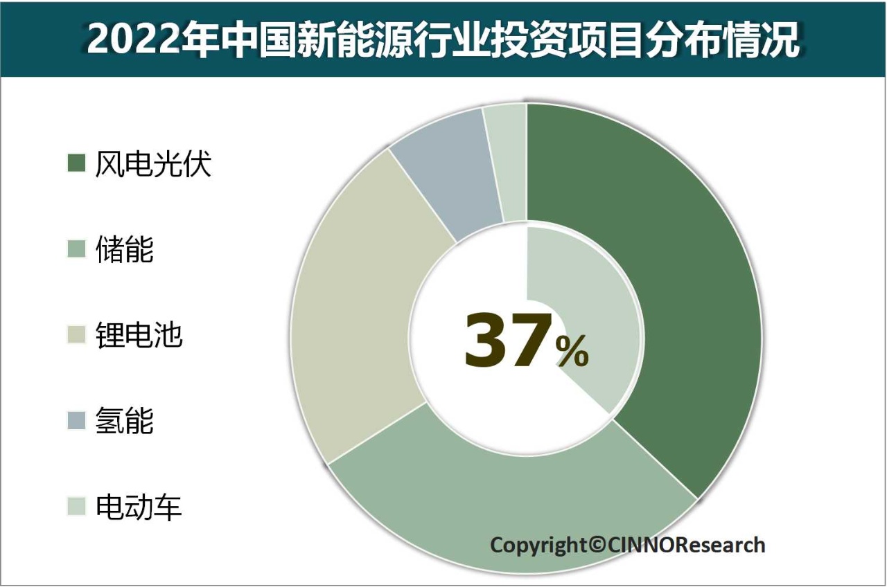 Research统计数据显示,2022年中国新能源项目投资金额高达9.2万亿人民币(含中国台湾),新能源产业已经成新兴科技产业的重点投资领域。2022年中国(含中国台湾)新能源行业内投资资金主要流向风电光伏,金额约为3.4万亿人民币,占比约为36.9%;储能投资总额2.7万亿人民币,占比约为29.3%。锂电池储能投资总金额2.2万亿人民币,占比约为23.6%;氢能投资总额超6,800亿人民币,占比约为7.4%。