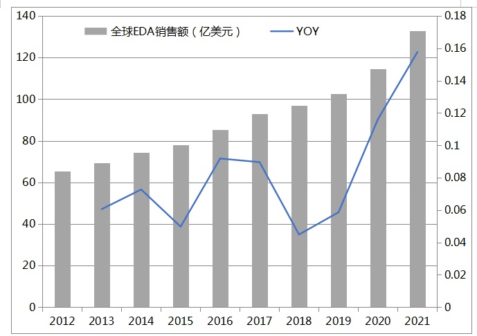全球EDA市场增速快于全球半导体行业。根据SEMI,2012年,全球EDA销售额65.36亿美元。2021年,全球EDA销售额132.75亿美元。2012-2021期间,全球EDA销售额年化复合增速8.19%,高于同期全球半导体整体销售额7.43%的复合增速。