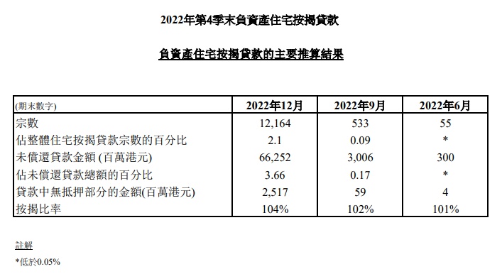 负资产住宅按揭贷款涉及的金额由2022年第3季末的30亿6百万港元,增加至2022年第4季末的662亿5千2百万港元。负资产住宅按揭贷款中无抵押部分的金额由2022年第3季末的5千9百万港元,增加至2022年第4季末的25亿1千7百万港元。银行自从2011年第1季起,并无录得任何拖欠3个月以上的负资产住宅按揭贷款纪录。