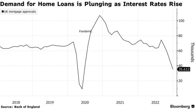 智通财经APP获悉,由于更高的借贷成本对房地产市场造成影响,英国抵押贷款批准率降至两年半以来的最低水平。英国央行周二公布的数据显示,银行和建筑协会在去年12月批准了35612笔住房贷款,是2020年5月英国房地产市场因疫情关闭以来的最低水平。