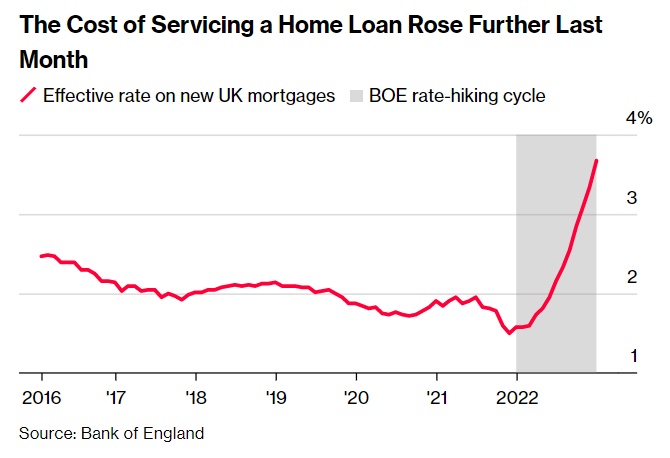 英国央行史无前例的一系列加息行动推高了抵押贷款成本。上个月新贷款的实际利率上升32个基点至3.67%,而一年前仅为1.58%。这是2015年底英国央行开始发布房屋贷款成本数据以来的最高涨幅和最大月环比涨幅。