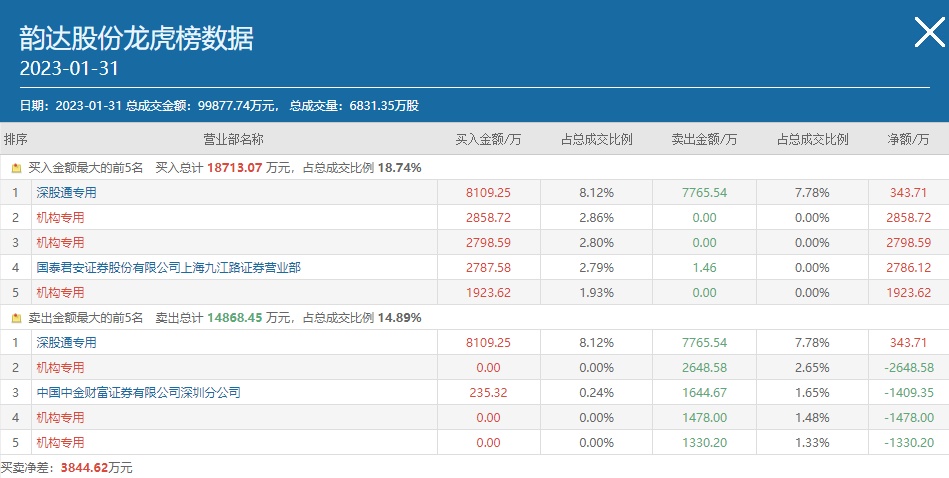 智通财经APP获悉,在披露全年业绩预盈公告后,1月31日,韵达股份(002120.SZ)喜提涨停,涨幅9.97%,收报14.78元/股,成交额9.99亿元。因属于日涨幅偏离值达7%而登上龙虎榜,盘后数据显示,机构博弈激烈,深股通专用席位买入8109.25万元并卖出7765.54万元,三机构净买入7580.92万元,三机构卖出5456.78万元。