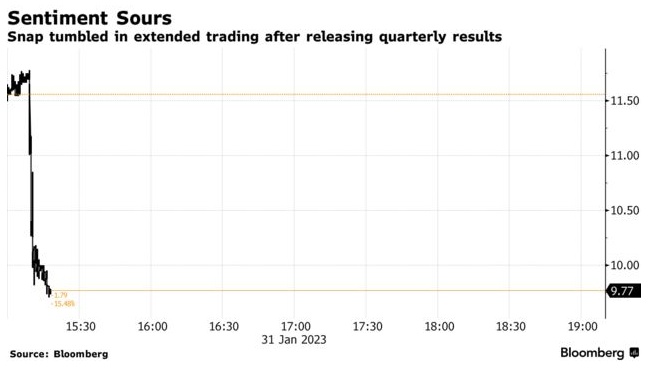 智通财经APP获悉,美东时间1月31日美股盘后,Snap(SNAP.US)公布了2022年第四季度及全年业绩。其中,Snap提供了业绩指引,预计2023年第一季度营收将首次出现季度下滑,理由是Snapchat广告产品的一系列变化可能会对该社交媒体应用的业务造成破坏。