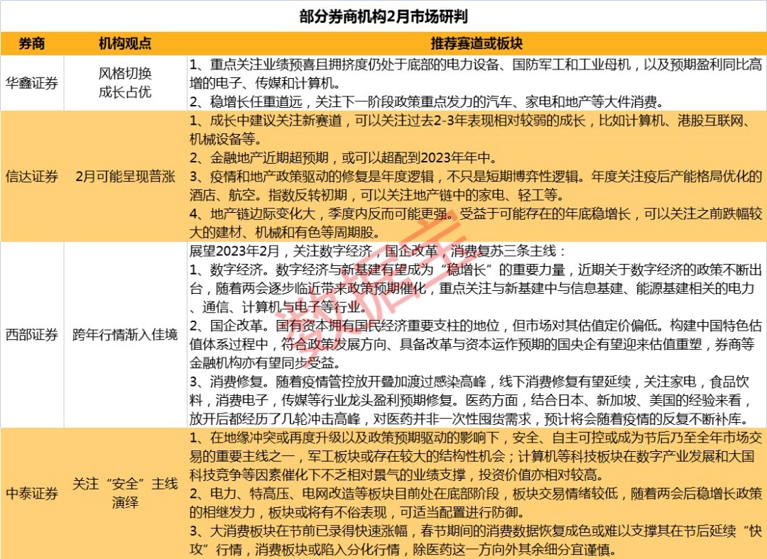 招商证券认为,2月市场有望完成大盘蓝筹向科技成长股行情转变;光大证券认为,消费医药或成为今年“春季躁动”的主旋律。