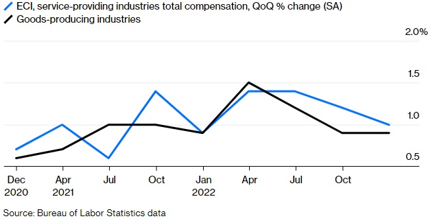 当地周二公布的数据表明,美联储控制通胀低于目标水平现可能并不像之前所想象的那么遥远。2022年最后一个季度,美国服务提供行业的总薪酬成本以1%的速度增长,低于今年早些时候1.4%的峰值。按年率计算,这意味着服务业薪酬通胀率趋势约为4.2%,虽明显高于2017-2019年2.8%的平均水平,但该数据指标正朝着好的方向发展。当前趋势的延续就服务业工资水平的调控来说,让政策制定者可能在未来一两个季度内处于一个舒适的位置。