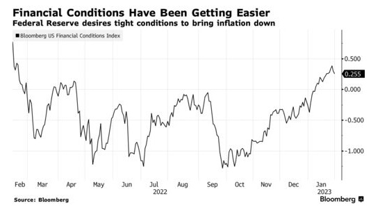 由于投资者押注通胀下降将使美联储提前停止加息,然后在今年晚些时候选择降息,目前的金融环境达到了自去年2月以来最宽松的水平。但包括股市和债市上涨在内的这些条件可能会刺激更多支出,从而阻碍美联储抗通胀的努力。