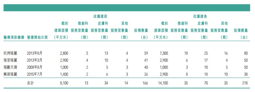 具体而言,为满足顾客对新产品和新技术的需求,瑞丽医美在过去的12-18个月,通过改扩建及新设备引进增强了非手术类医疗美容服务的能力,尤其是加大了微创美容服务及皮肤美容服务科室的投入。如下图所示,通过不断的内生发展,瑞丽医美旗下的4家旗舰店规模不断扩大,服务也更加多样化。