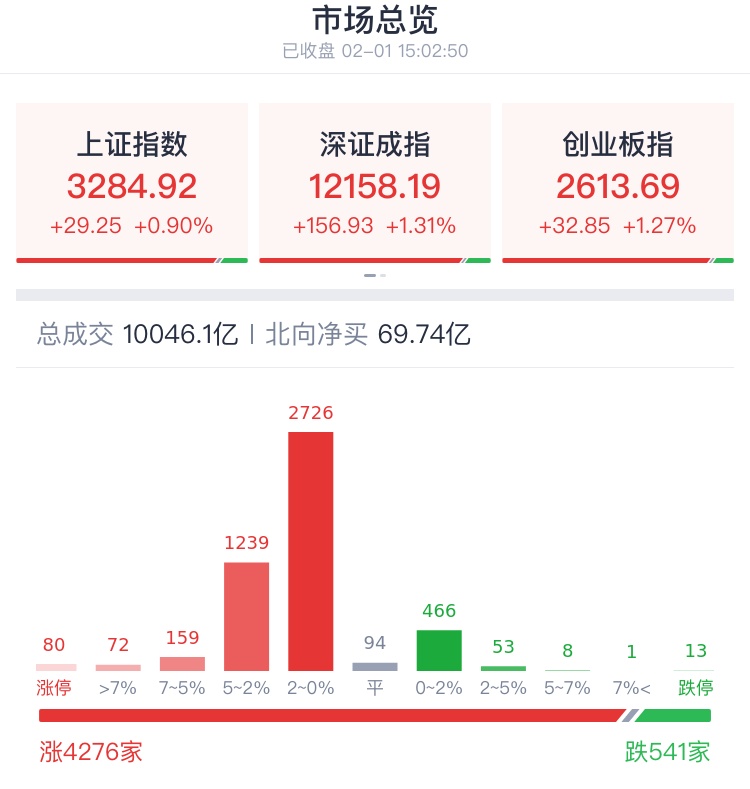 今日A股高开,随后上演V型反弹,午后A股持续猛拉,成交额突破万亿元,截至收盘,沪指涨0.90%,报3284.92点;深成指涨1.31%,报12158.19点;创业板指涨1.27%,报2613.69点。