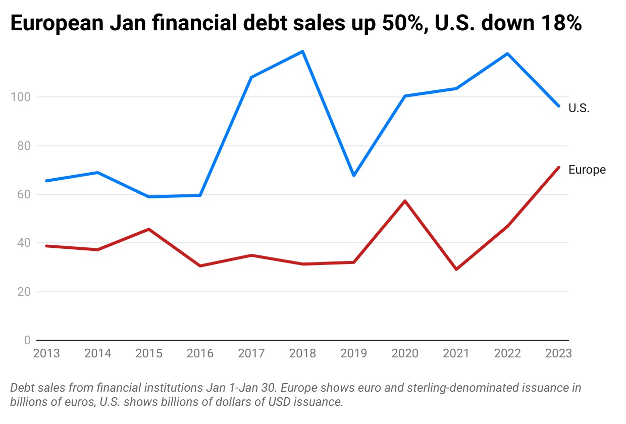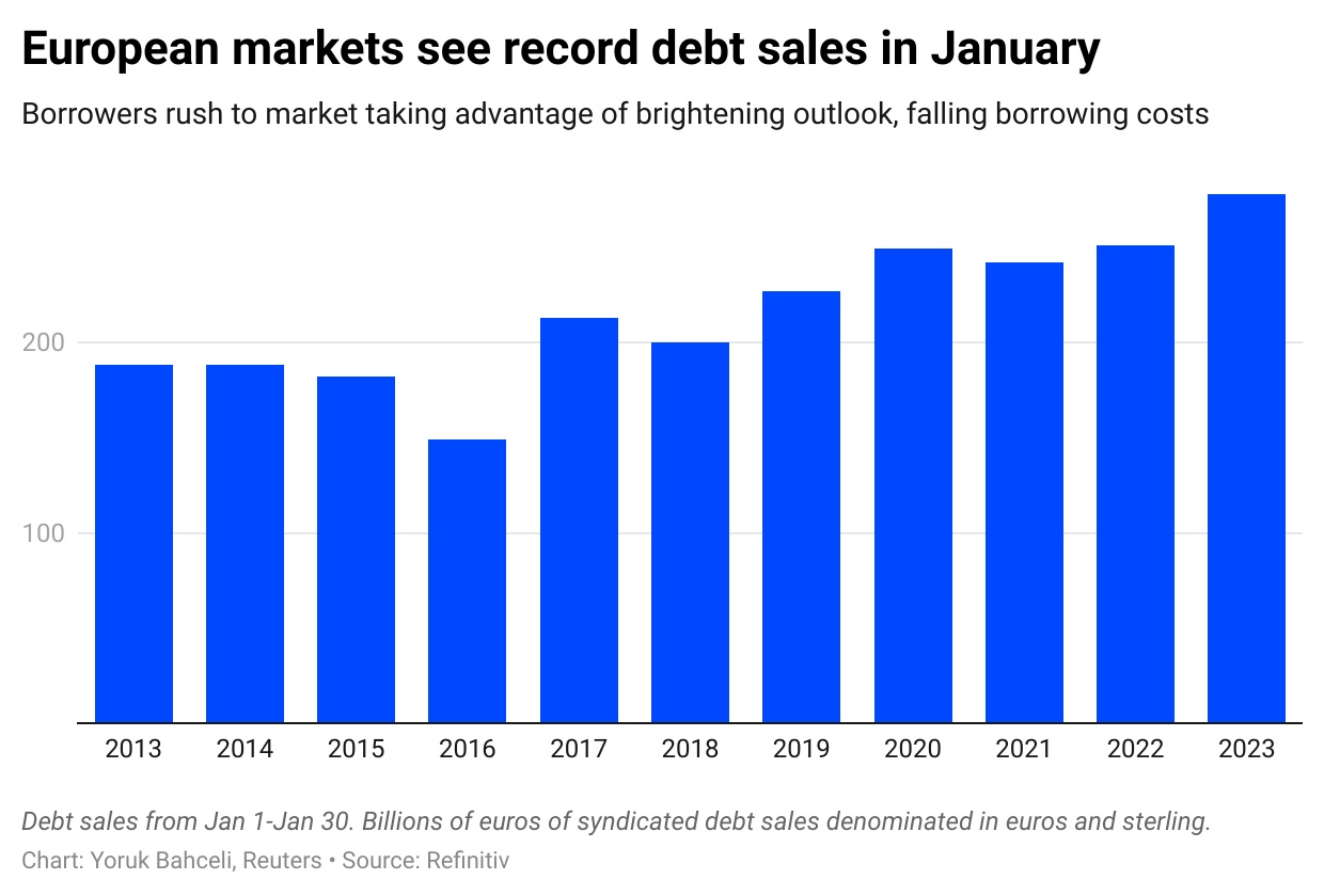 除了市场情绪好转之外,借贷成本的大幅下降也推动欧洲借款人加快融资计划。德国十年期国债收益率在1月份下跌了25个基点,为有记录以来最大的年初跌幅之一。
