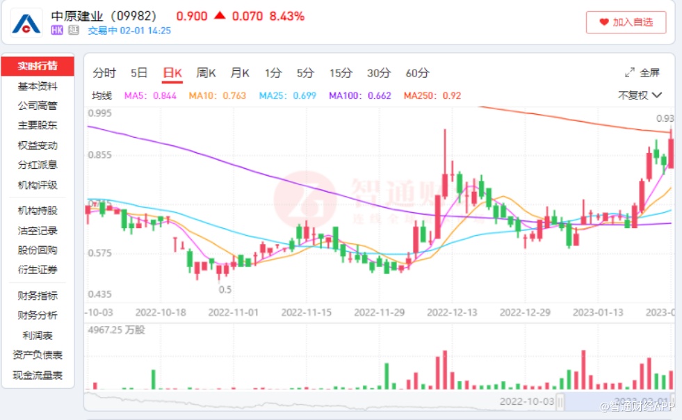 1月20日至2月1日,中原建业(09982)股价迎来新一轮大幅反弹。近6个交易日内,股价由0.65港元上涨至0.93港元,期间最高涨幅达到43.1%。2022年10月,中原建业股价一度下探至0.5港元的历史低点,如今回过头来看,当时的股价区域已成“黄金底”。