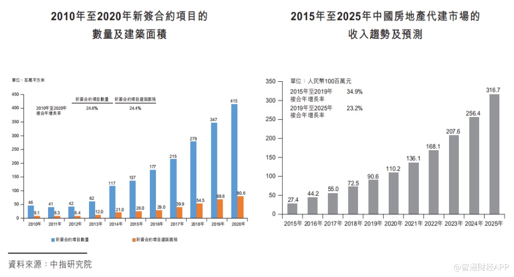 据此展望房地产代建市场发展大势,未来的成长前景仍可适当乐观。根据中指研究院数据,中国房地产代建行业经历了长期长期快速成长期。自2010年至2020年,中国房地产代建市场新签合约项目的数量及建筑面积的复合年增长率均分别超过24.0%。房地产代建行业的总收入在2019年达到91亿元,2015年至2019年的复合年增长率为34.9%,预期市场规模在2025年将达到317亿元,2019年至2025年的复合年增长率为23.2%。