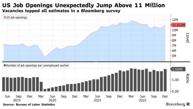 美国职位空缺数在2022年底出人意料地增加,表明对劳动力的需求稳固,美联储认为这是降低通胀的最后障碍之一。