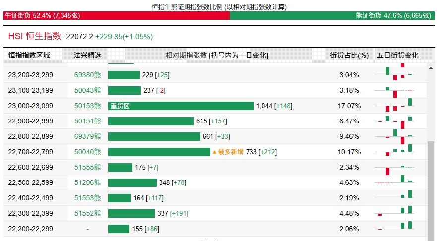 法兴恒指牛熊证街货分布图中的数据显示,熊证街货重货区在23000-23099区间,该区间最新熊证数量为1044张,较上一交易日增加148张。最多新增都在22700-22799区间,该区间最新熊证数量为733张,较上一交易日增加212张。