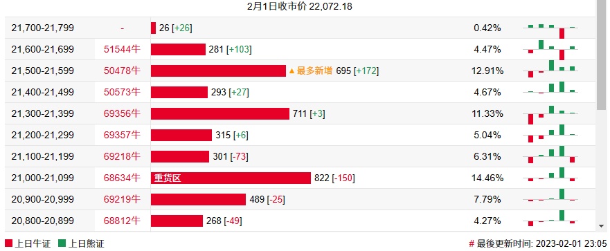 牛证街货重货区在21000-21099区间,该区间最新牛证数量为822张,较上一交易日减少150张。最多新增在21500-21599区间,该区间最新牛证数量为695张,较上一交易日增加172张。