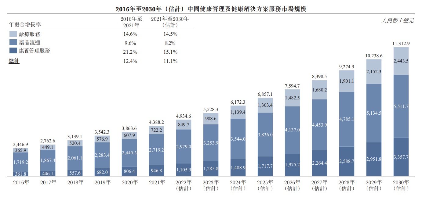 新冠疫情令与在线诊疗服务和药品及医疗健康产品销售等在线医疗服务相关的需求和供应链同人们对优质、便捷、智能、高效的医疗健康服务的需求陡增。据灼识称,中国健康管理及健康解决方案市场规模一直在大幅增长,从2016年的2.45万亿元到2021年的4.39万亿元,年复合增长率为12.4%,预计2030年将达到11.31万亿元,从2021到2030年的年复合增长率为11.1%。