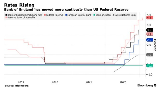 英国央行做出上述决定之前,美联储周三加息25个基点,标志着其大举收紧政策的步伐放缓。预计欧洲央行周四晚些时候也将把基准利率上调50个基点,至3%。