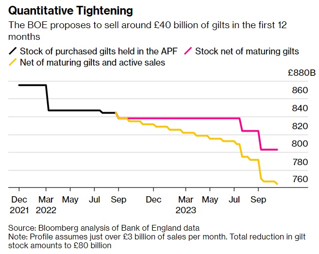 在十多年的量化宽松政策中,英国央行建立了价值8950亿英镑的政府和企业债券组合。而如今,该央行正在通过允许债券到期和直接销售的方式逐步缩减资产负债表。