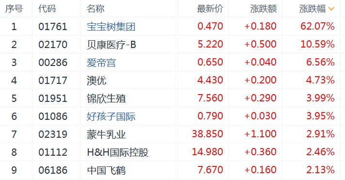 在众多上涨的板块中,相关婴童概念股更是凭借政策利好表现亮眼。宝宝树集团(01761)收涨62%,盘中一度涨逾100%。童园国际收涨近50%,盘中一度上涨超145%。中国育儿网络收涨近40%,盘中一度涨超90%。此外,就连与婴童食品概念蜡笔小新还录得了超30%的涨幅。