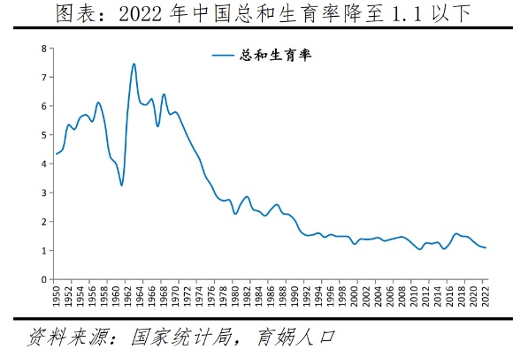 国家统计局数据披露,中国总和生育率从1970年代之前的6左右,降至1990年的2左右,再降至2010年后的1.5左右,2021年仅1.15,2022年或不到1.1,仅为世代更替水平(2.1)的一半,全球倒数。